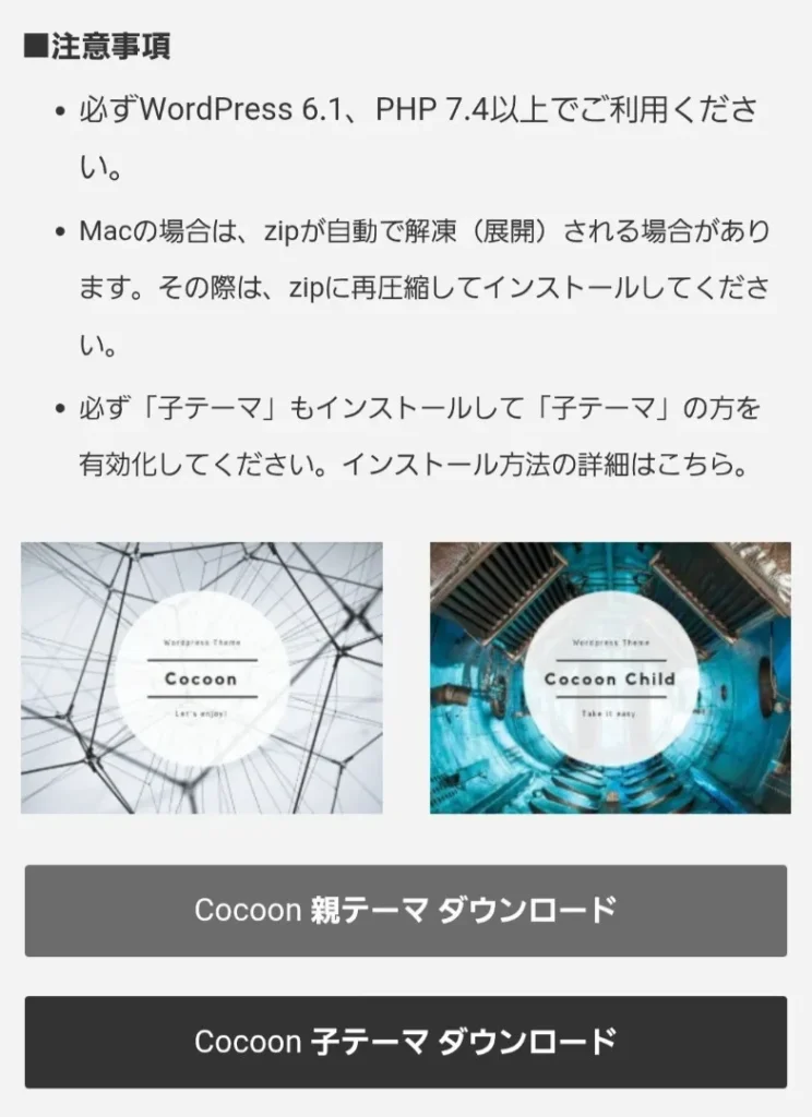 ConoHa WINGの管理画面からもCocoonはインストールできるのですが、ファイル名が変更されており、不具合が生じることがあるようです。現在は修正されているのかもしれませんが、今回は安心して利用できる公式ページからダウンロードします。